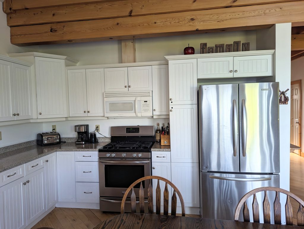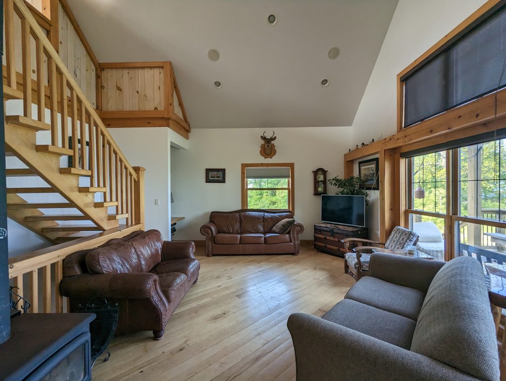 The main/ 2nd level has a full eat-in kitchen, living room, bathroom and the 2 main bedrooms each with a King sized bed. The bedrooms have access to the back deck which overlooks the pond & forrest. The living room/ kitchen has access to the covered front deck which overlooks Lake Erie.