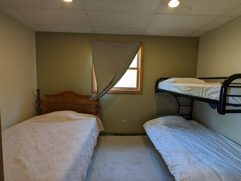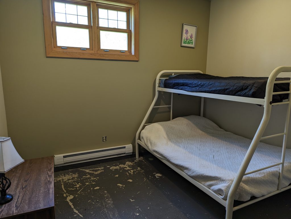The ground floor has 2 bedrooms (1 with a queen bed, the other with a double/single bunk bed), a bathroom, kitchenette, rec room and storage areas.